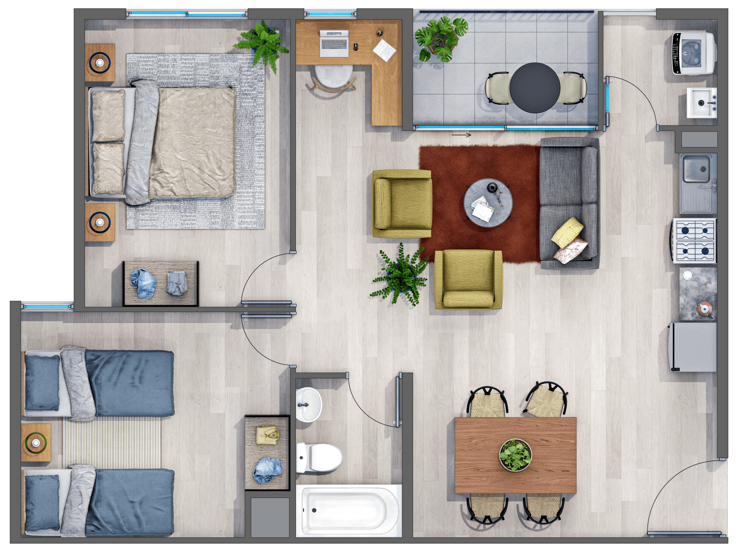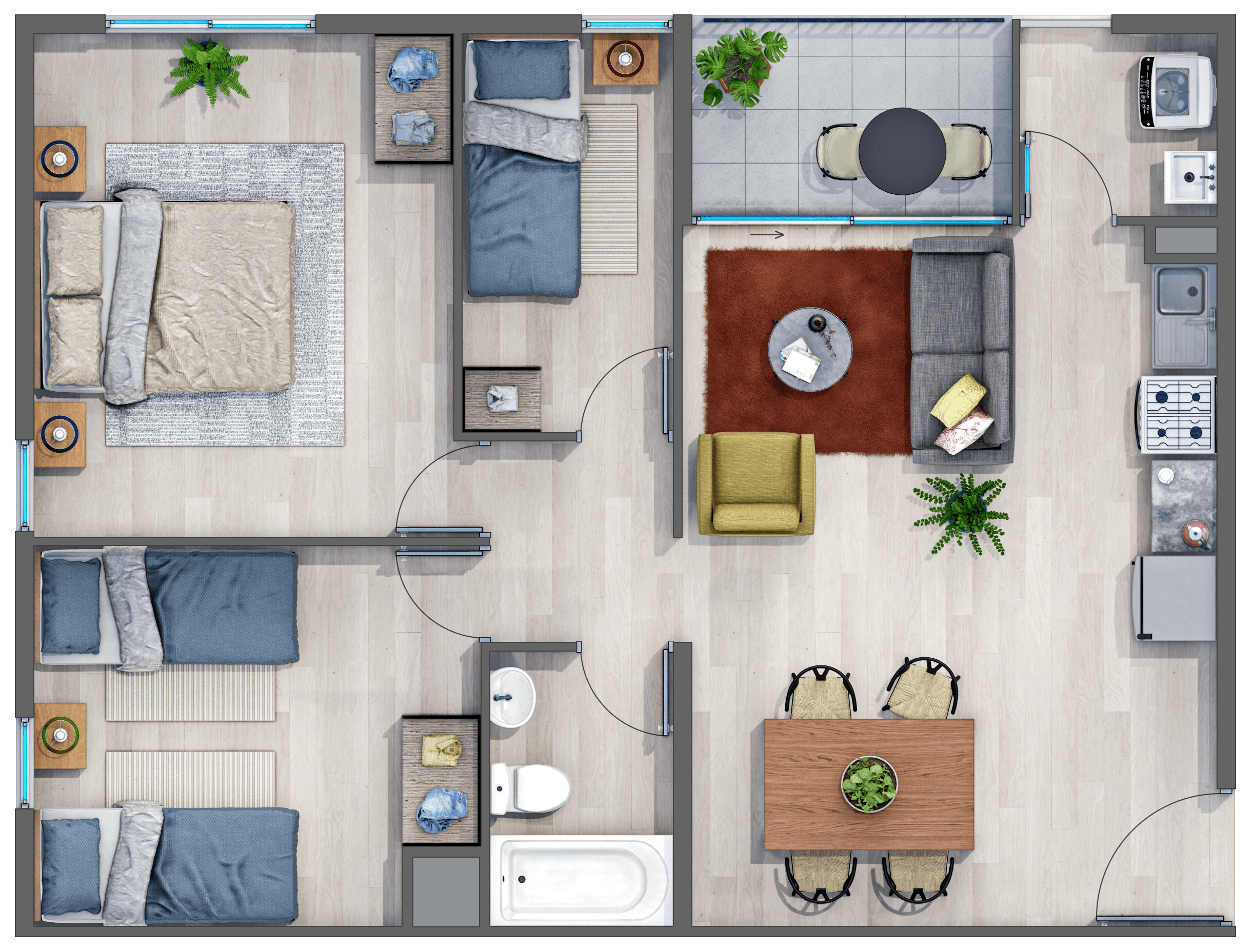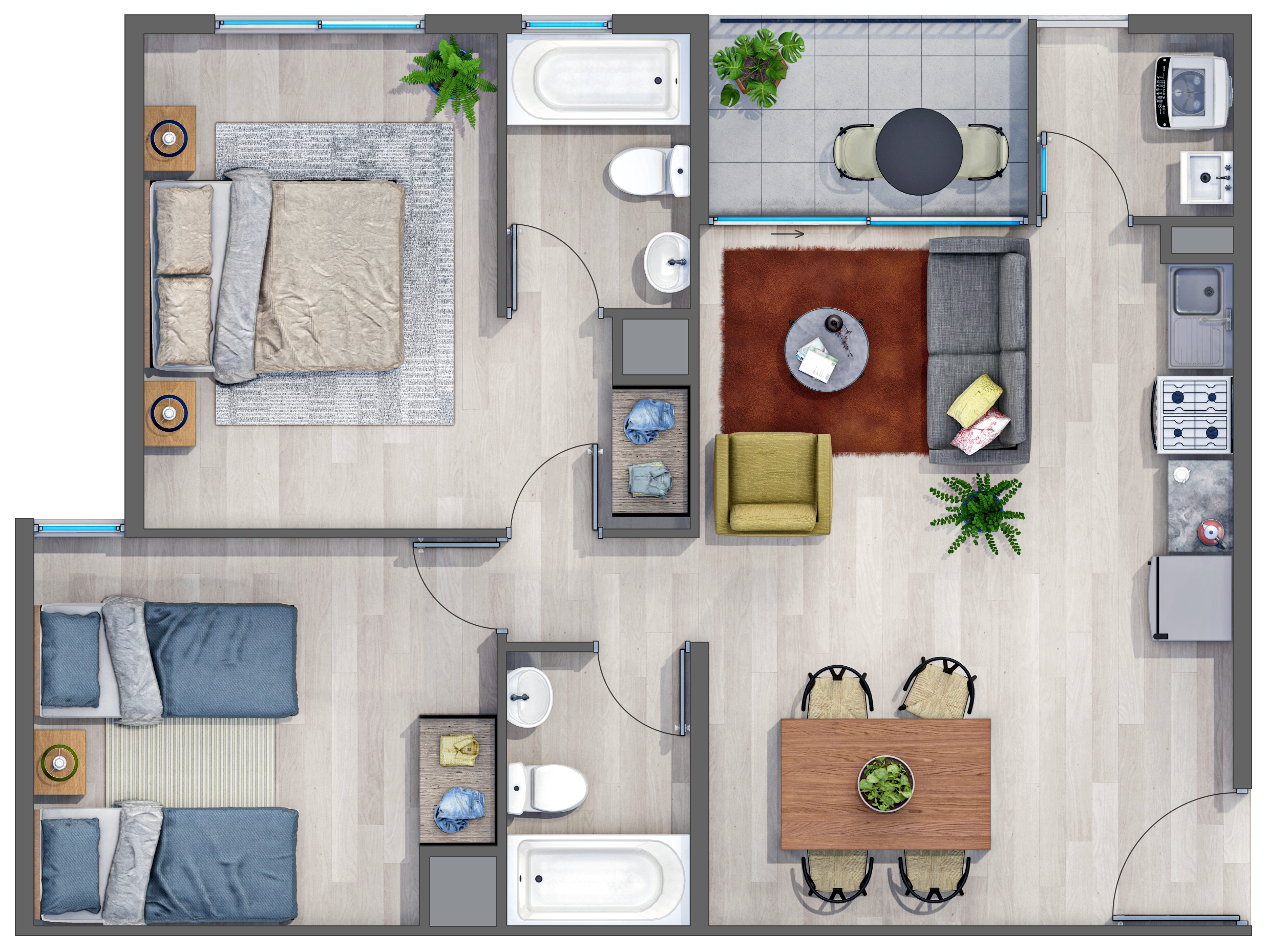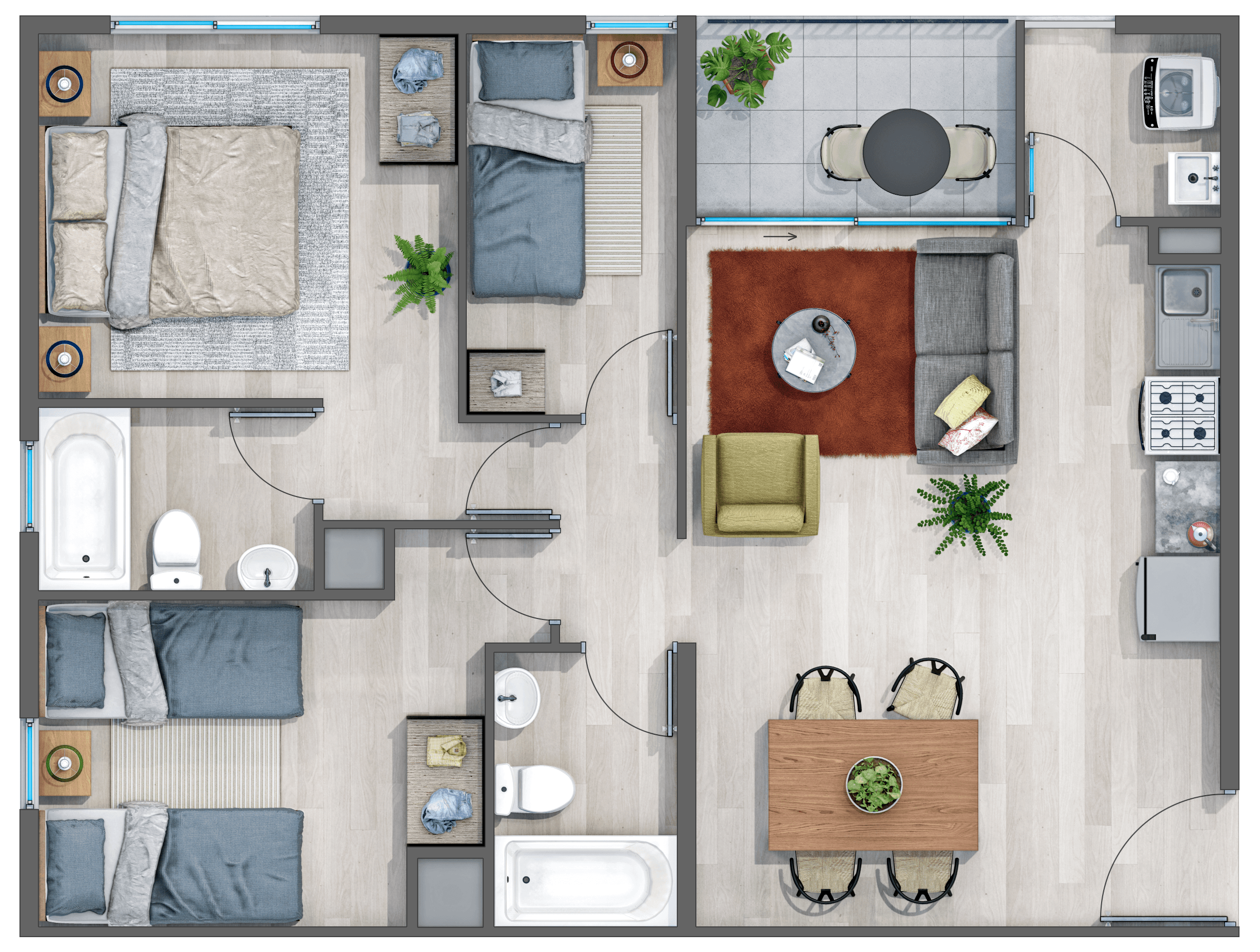 Aislación térmica EIFS, todas las ventanas del departamento son termopanel, caja escalera cerrada, medidores y shaft independientes. Ventana PVC blanco, piso vinílico, terraza en todas las tipologías, todos los departamentos sobre 60 m2.